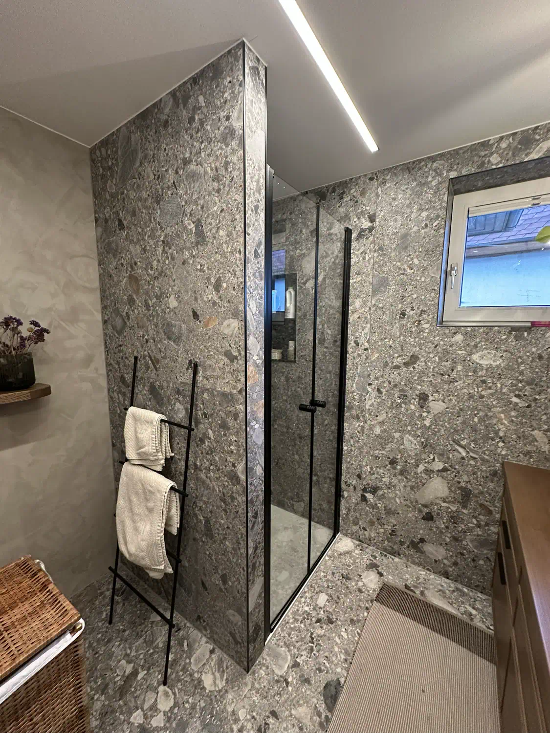 Nach den Mauer- und Verputzarbeiten wurde eine Rigipsdecke eingezogen und hochwertige Fliesen verlegt.