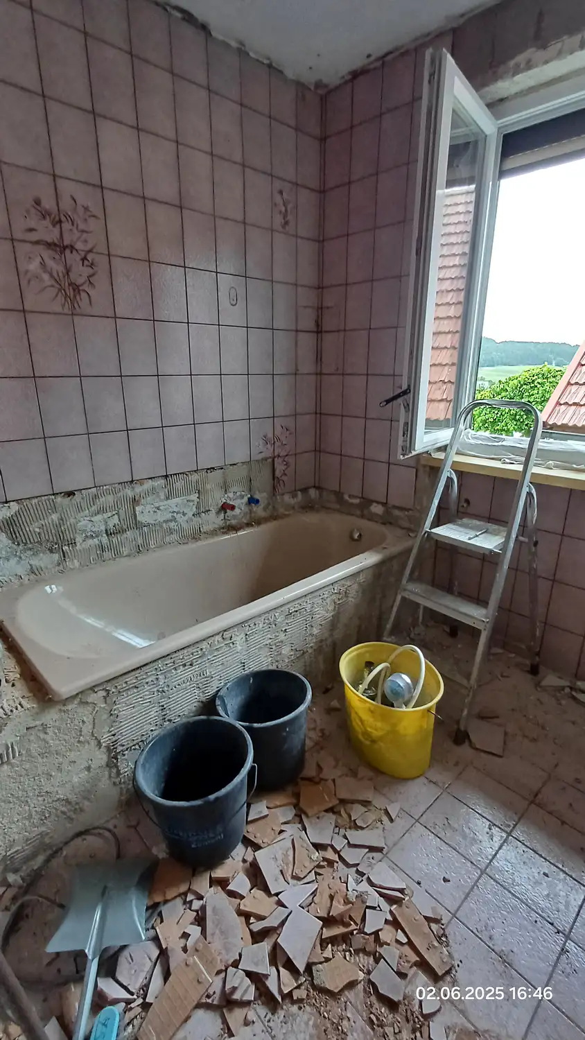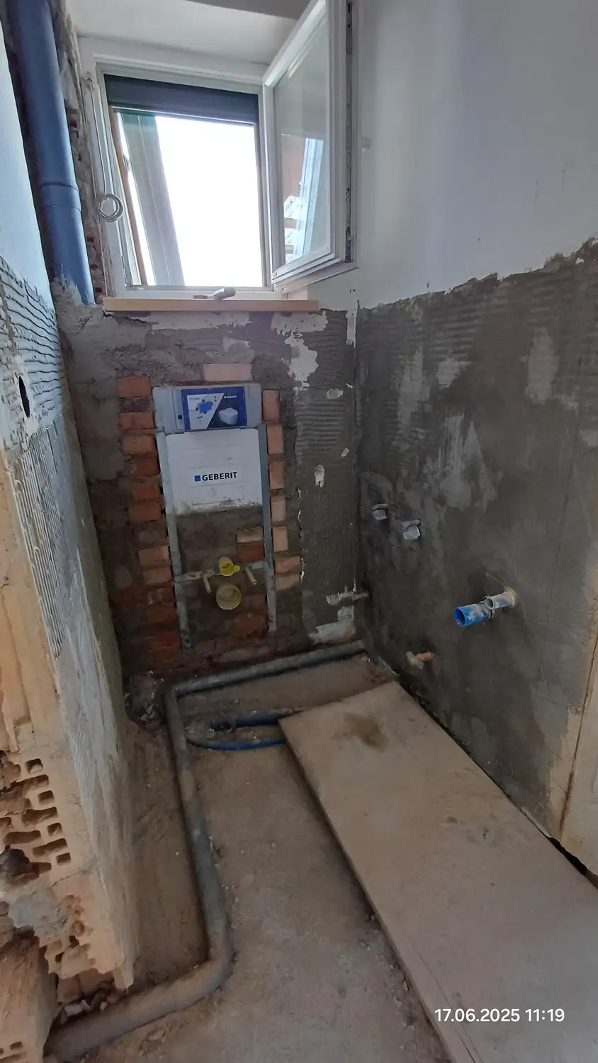Nach der vollständigen Entkernung wurden sämtliche Installationen neu durchgeführt. Anschließend folgten präzise Mauer- und Verputzarbeiten sowie das fachgerechte Verlegen der neuen Fliesen.